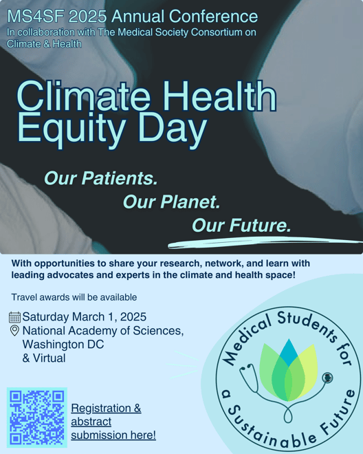 Medical Students for a Sustainable Future will host its annual conference on Saturday, March 1, 2025, in collaboration with the Medical Society Consortium on Climate and Health. This event will give health students an opportunity to build community, connect with leaders, present research, and engage in impactful discussions around climate and health.